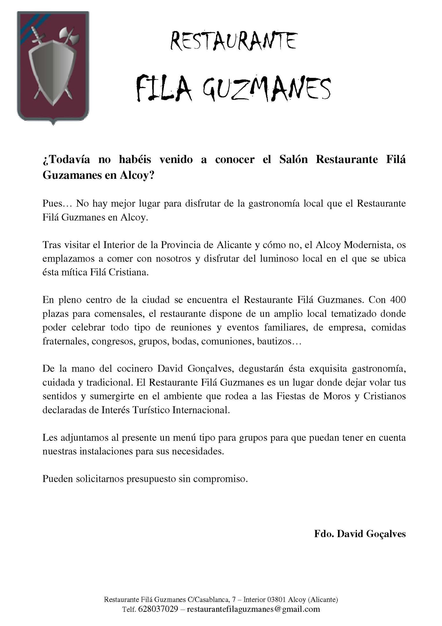 Escribo en representación de la Taberna Alkázar,. Somos un restaurante que estamos en Valencia desde 1950 y nos encantaría recibir a los guías que estén interesados. Les adjunto los menús que tenemos para grupos de turismo con la intención de acercarles a nuestra gastronomía. Os adjunto 3 menús de 25 euros con IVA incluido y además, 1 bebida, café y postre.